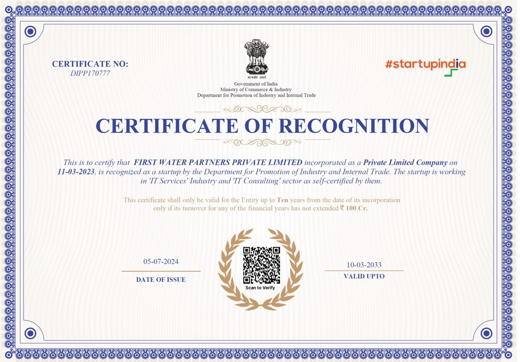 First Water Partners is a Registered Startup under Department for Promotion of Industry and Internal Trade, Ministry of Commerce & Industry, Government of India